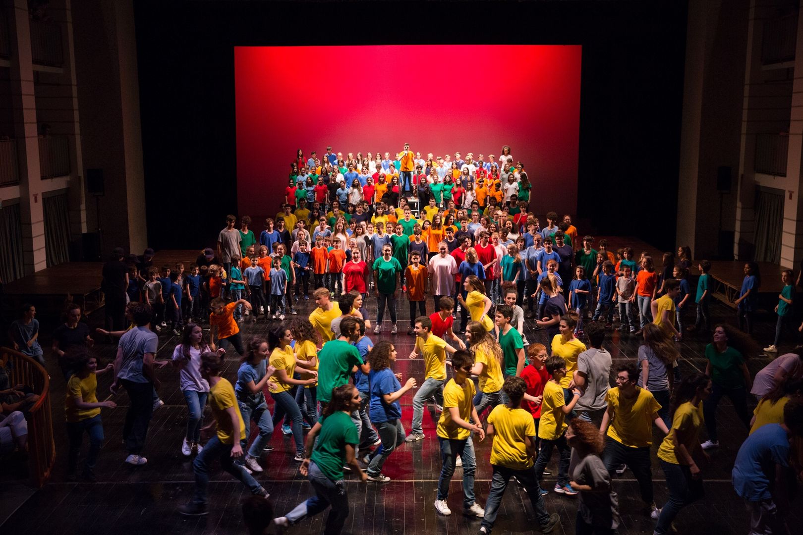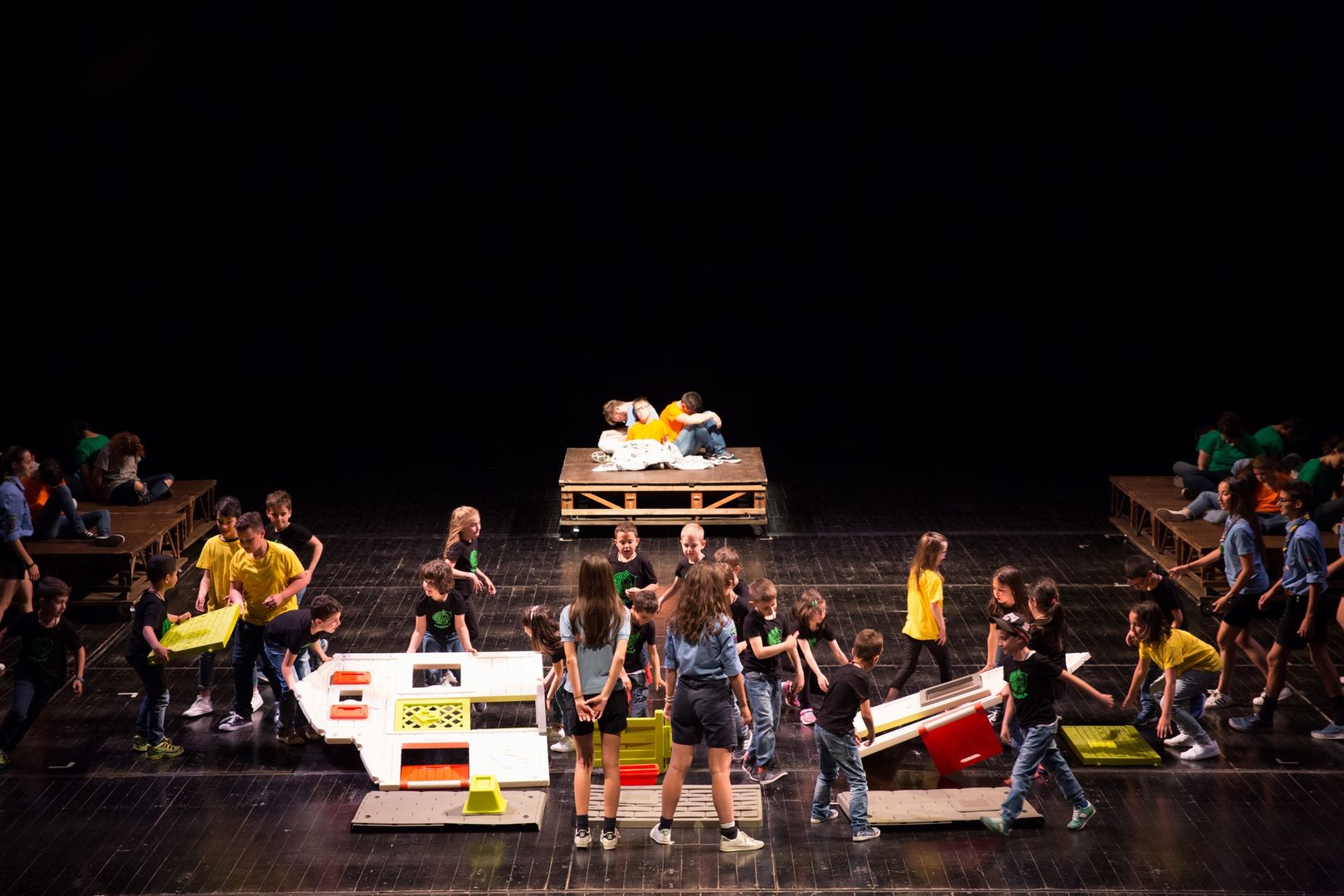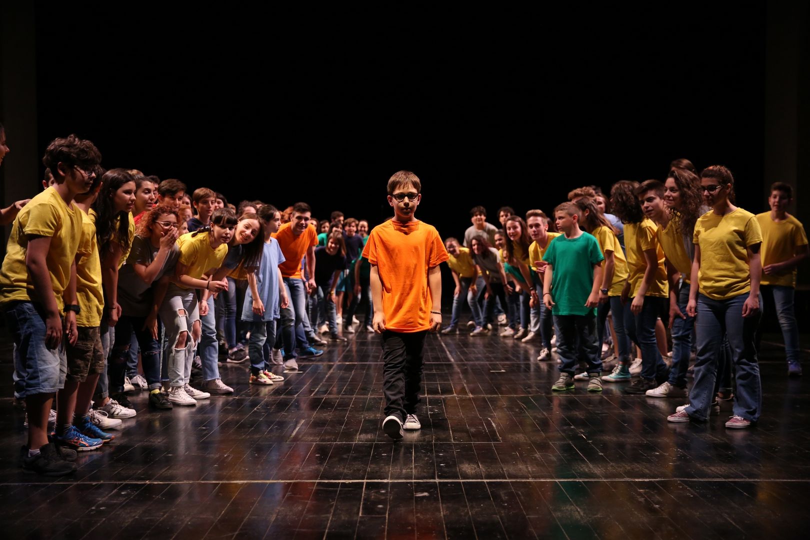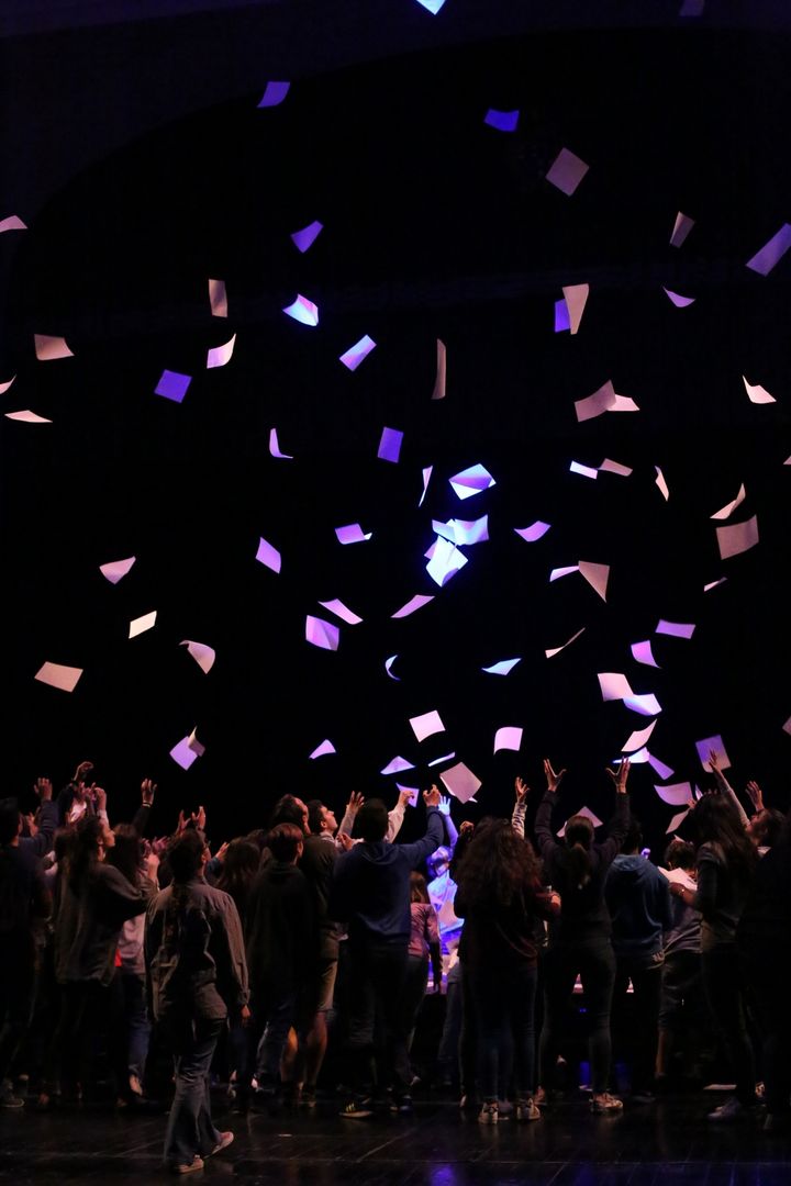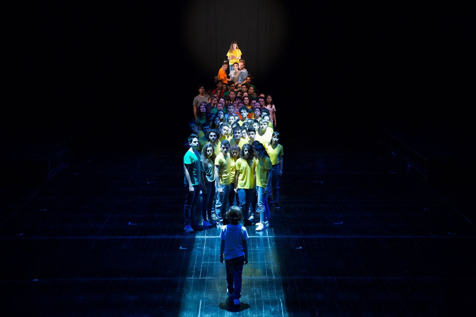 Un gioco di cori che si inseguono, di voci che si rincorrono, di coreografie che portano l’azione sui palchi e in platea, di parole nate dal lavoro che i drammaturghi professionisti del Teatro dell’Argine hanno fatto con i giovanissimi partecipanti nel corso di un anno di laboratorio teatrale: una pratica di teatro condiviso, un ambizioso lavoro di ascolto e di partecipazione attiva.