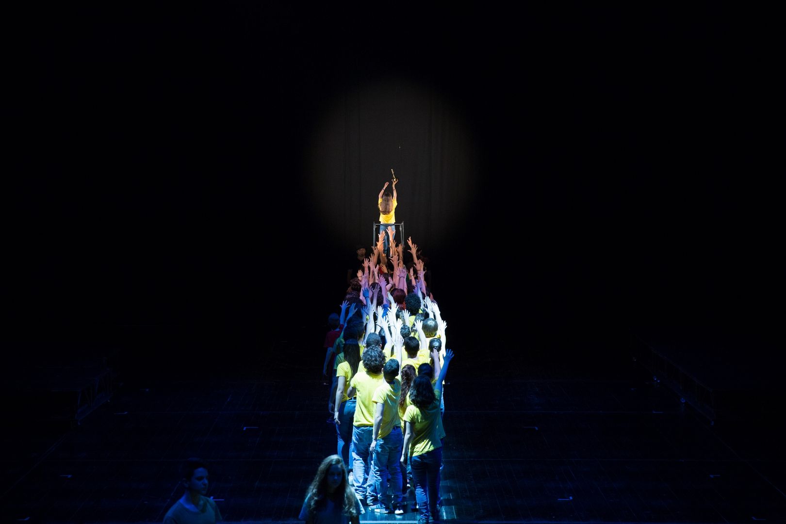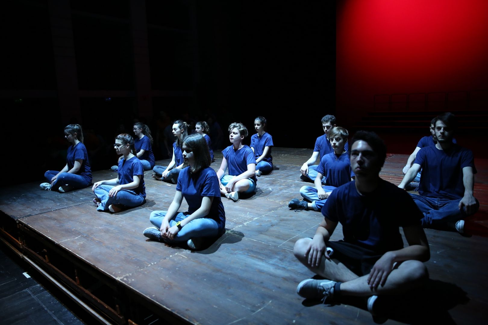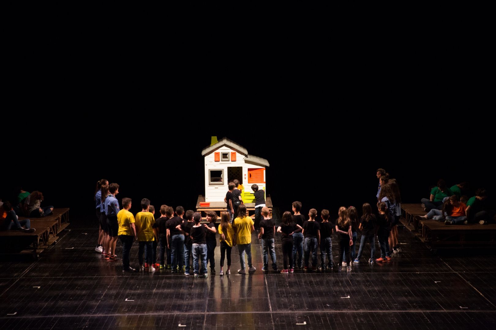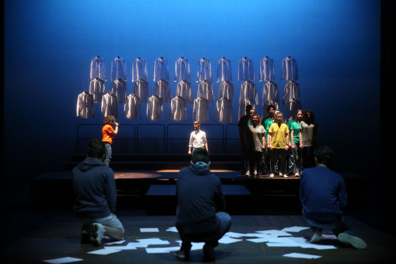 Un gioco di cori che si inseguono, di voci che si rincorrono, di coreografie che portano l’azione sui palchi e in platea, di parole nate dal lavoro che i drammaturghi professionisti del Teatro dell’Argine hanno fatto con i giovanissimi partecipanti nel corso di un anno di laboratorio teatrale: una pratica di teatro condiviso, un ambizioso lavoro di ascolto e di partecipazione attiva.